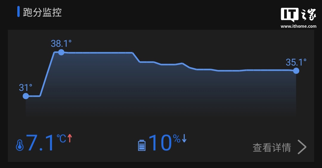 而 ROG 9 Pro 的最高温度只有 38.1 度,比上一代低了 2.3°,且在温度到达最高点后逐渐下降至 35° 附近,被动散热压力明显更小。