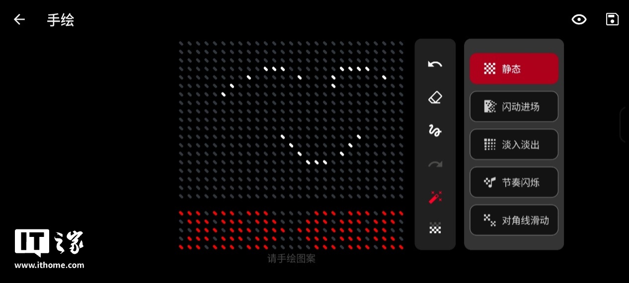 用户也可以通过手绘或导入外部文件进行自定义,手绘模式中屏幕分为 2 个部分,上面白色部分可以自由创作,支持 5 种动画效果预设;下面红色部分可选择不显示,也可以应用四种自带的动画预设模板,可玩性非常高。