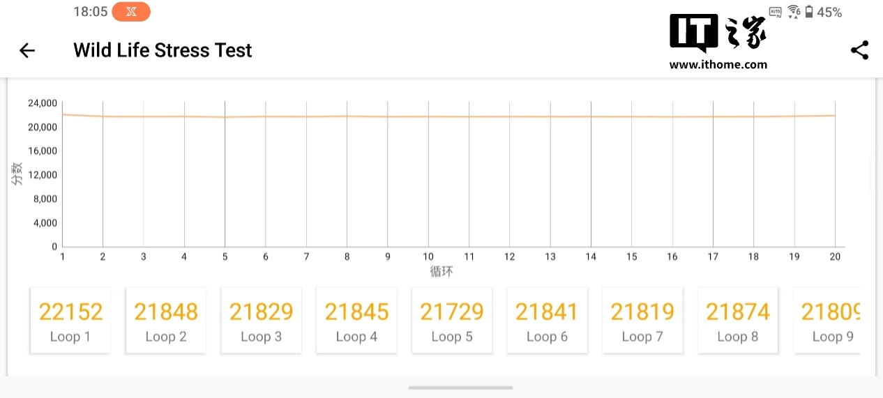 在另一项 Wide Life Stress Test 压力测试中,ROG 9 Pro 在“X 模式”下跑出了一条直线的水平,20 轮循环分数中,最佳循环分数为 22152 分,最低虚幻分数为 21729 分,稳定性表成绩达到了 98.1%,由此可见在不借助外部风扇散热的情况下,ROG 9 Pro 的理论性能就已经非常出色了。