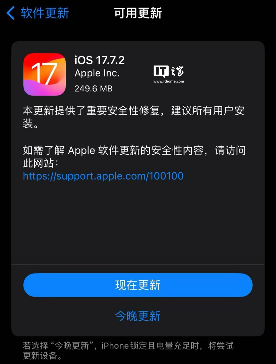 文章来源于互联网:IT之家-苹果发布 iOS / iPadOS 17.7.2 更新:含重要安全修复,建议用户安装