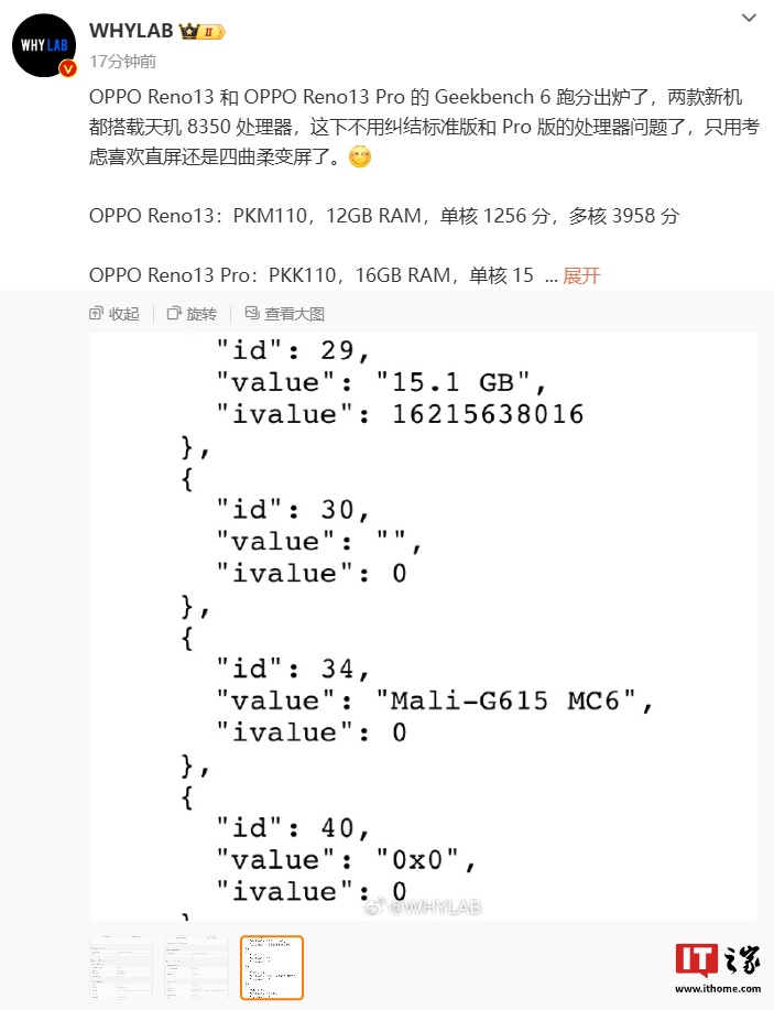 博主 @WHYLAB 今日发文称,上述机型为 OPPO Reno 13 系列新机的标准版和 Pro 版,均搭载天玑 8350 处理器。