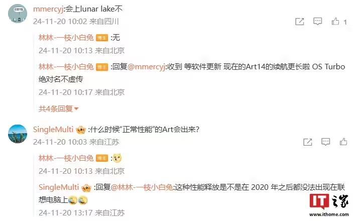 另外,他还在微博评论区回复了部分用户关于荣耀笔记本的相关问题:针对是否会上 Lunar Lake,他回复“无”;针对后续负责业务,他表示“中国区全场景”。