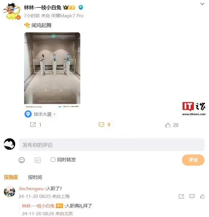 IT之家 11 月 20 日消息,联想前产品经理 @林林-一枝小白兔 在今年 4 月 30 日发文称已离开联想公司。他今日在自己微博评论区透露,已于本月初入职荣耀。