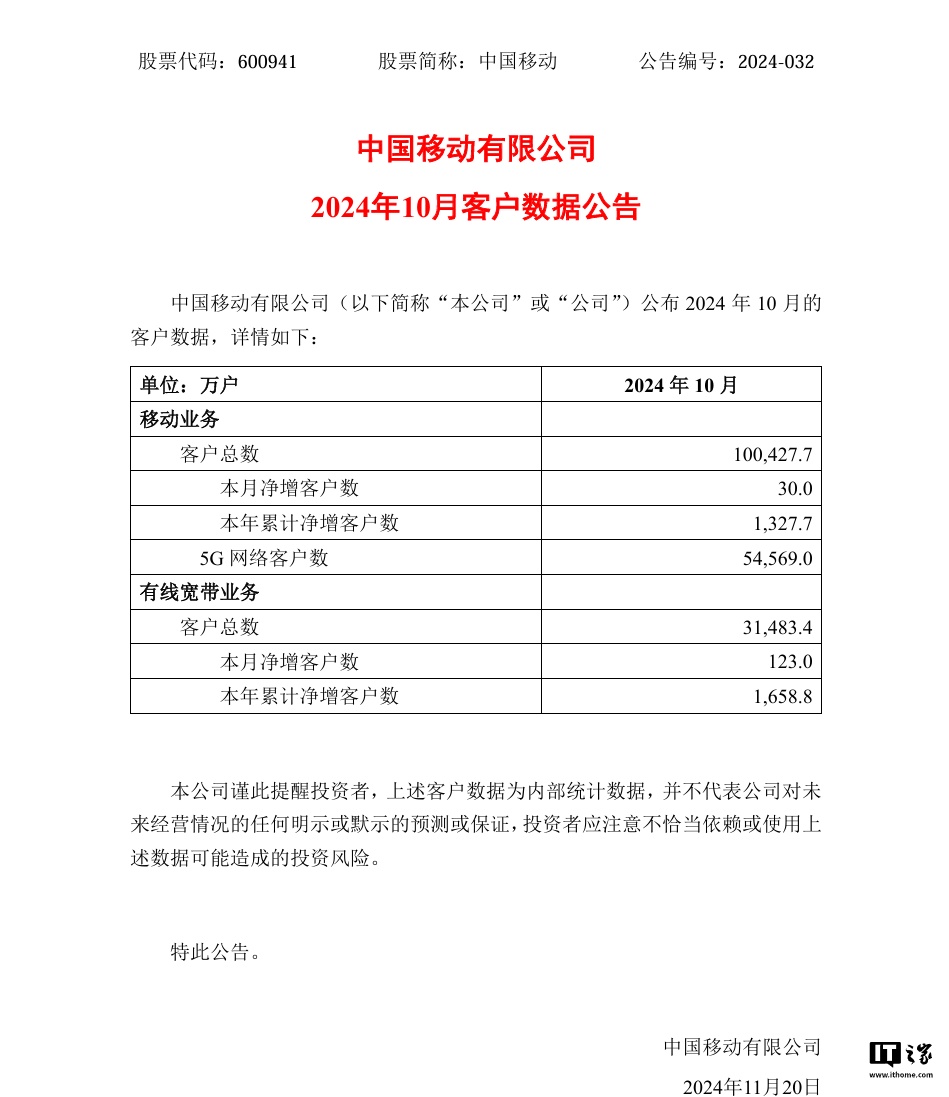IT之家 11 月 20 日消息,继中国电信之后,中国移动今天也发布了最新的用户数据公告。数据显示,2024 年 10 月移动业务客户总数达 10.04 亿户,当月净增客户数为 30 万户,本年累计净增客户数为 1327.7 万户。