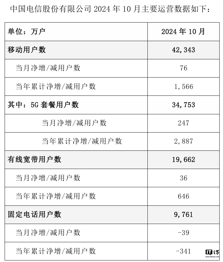 IT之家 11 月 20 日消息,中国电信今日发布用户数据公告,2024 年 10 月,公司移动用户总数为 4.23 亿户,当月净增 76 万户,年度累计净增 1566 万户。其中,5G 套餐用户数达到 3.48 亿户,当月净增 247 万户,年度累计净增 2887 万户。