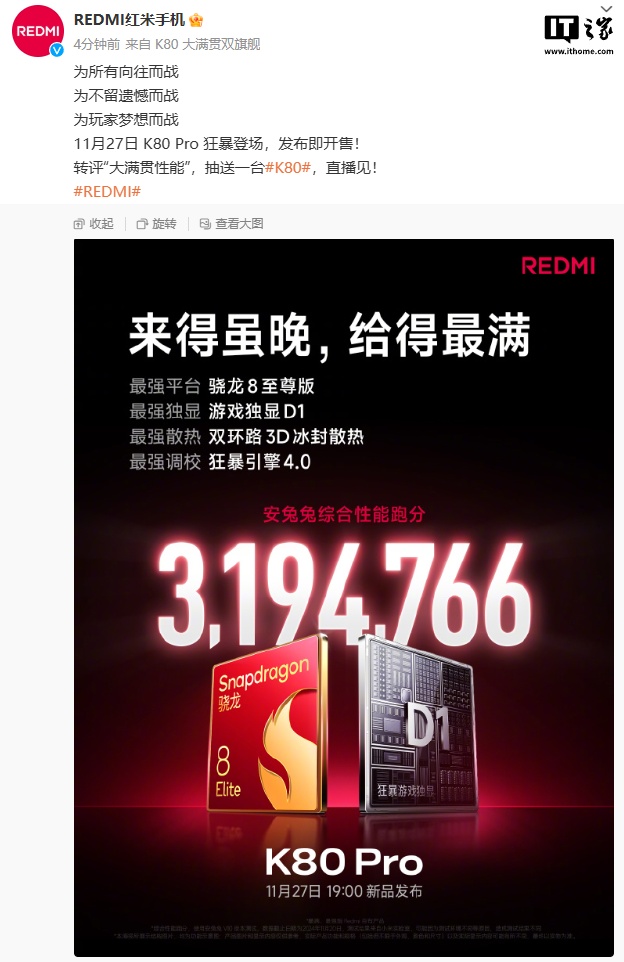 IT之家 11 月 22 日消息,小米今日官宣 REDMI K80 Pro 手机搭载骁龙 8 至尊版处理器、游戏独显 D1、双环路 3D 冰封散热、狂暴引擎 4.0,安兔兔综合性能跑分 3194766。