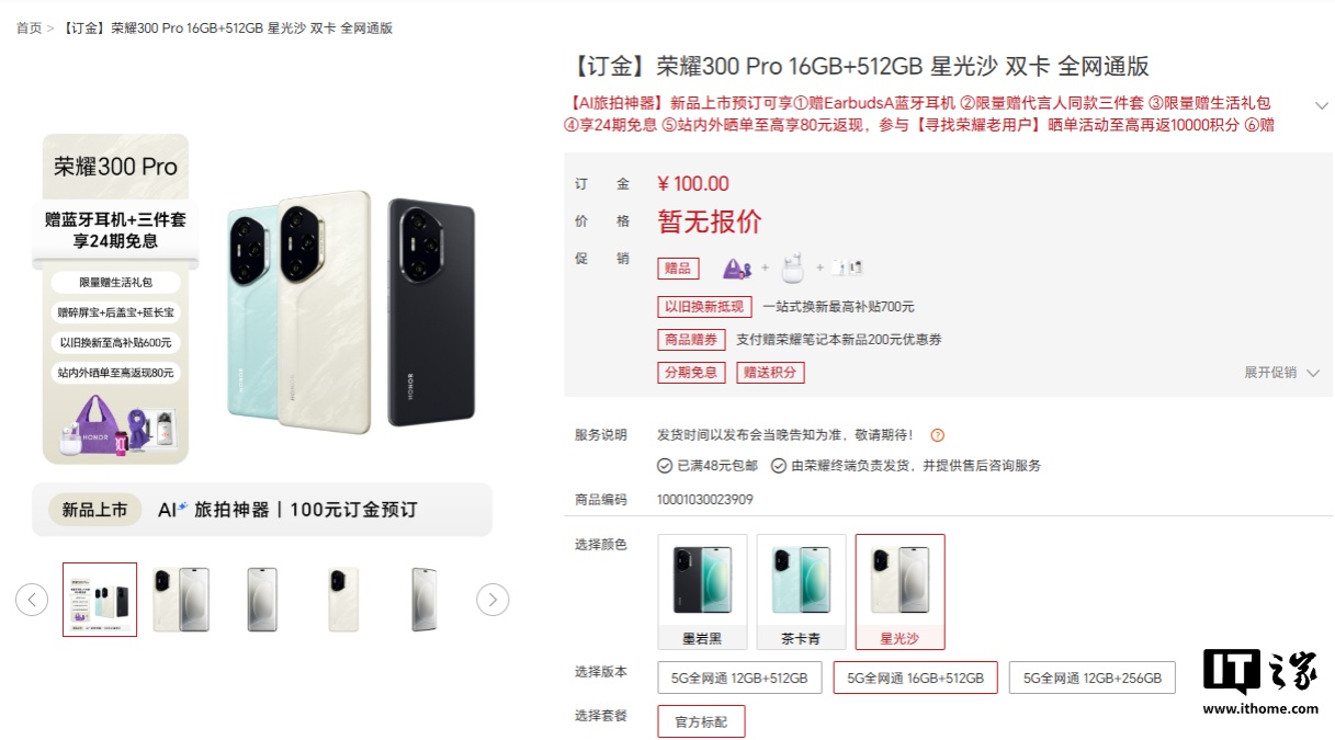 IT之家 11 月 22 日消息,荣耀 300 Pro 手机现已上架官方商城并公布三款外观配色,分别为墨岩黑、茶卡青、星光沙,新机采用曲面屏设计。提供 12GB+256GB、12GB+512GB、16GB+512GB 三个存储版本。