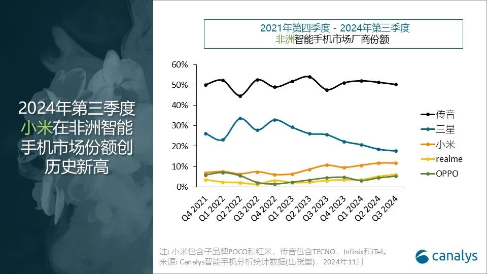 文章来源于互联网:IT之家-Canalys:2024Q3 非洲智能手机出货 1840 万台同比增长 3%,传音占一半份额、小米创新高