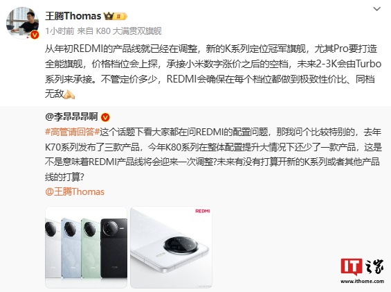 小米中国区市场部副总经理、REDMI 品牌总经理王腾今日发文就 REDMI 品牌产品线调整情况作出解释,他称新的 K 系列 Pro 机型价格档位会上探,承接小米数字涨价之后的空档,未来 2-3K 价位档会由 Turbo 系列来承接。