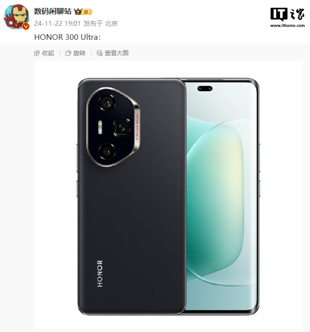 IT之家 11 月 23 日消息,在荣耀 300 标准版、Pro 版外观相继公布之后,博主 @数码闲聊站 还曝光了一款荣耀 300 Ultra 手机外观。