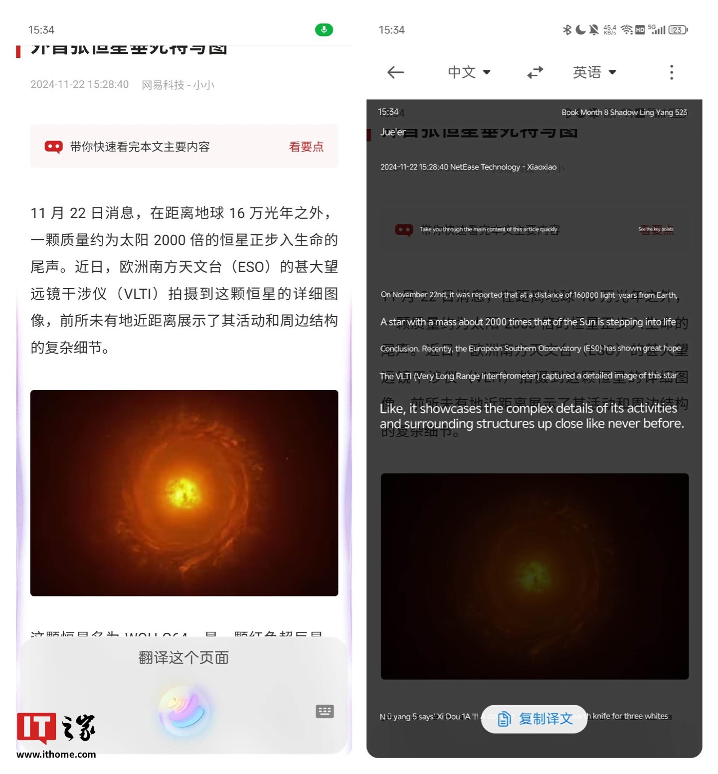 其中,AI 通话翻译支持实时双向翻译,可在通话中实时进行语音同声翻译传送和文字同步翻译显示,并支持多种外语及五种中国方言的互译。同时,这些翻译字幕将保存在录音机中的“星云翻译”中,用户还可以通过星云智能进行提取摘要、内容润色等多种 AI 文本处理。