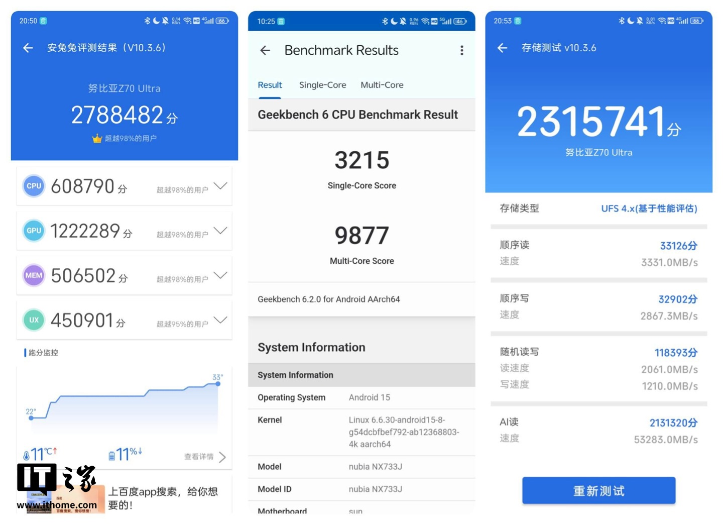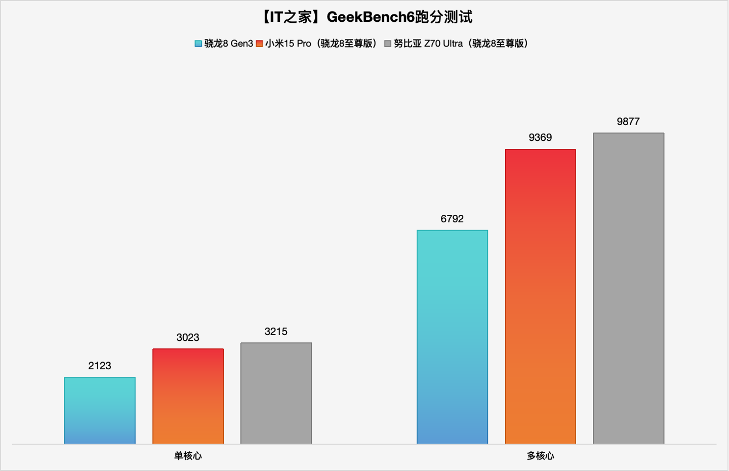例如,在 GeekBench 6 的跑分实测中,努比亚 Z70 Ultra 取得了单核心 3023 分和多核心 9877 分的成绩。