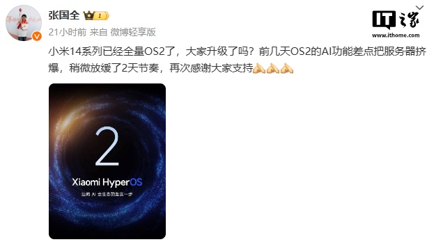 文章来源于互联网:IT之家-张国全:小米 14 系列手机已全量推送澎湃 OS 2