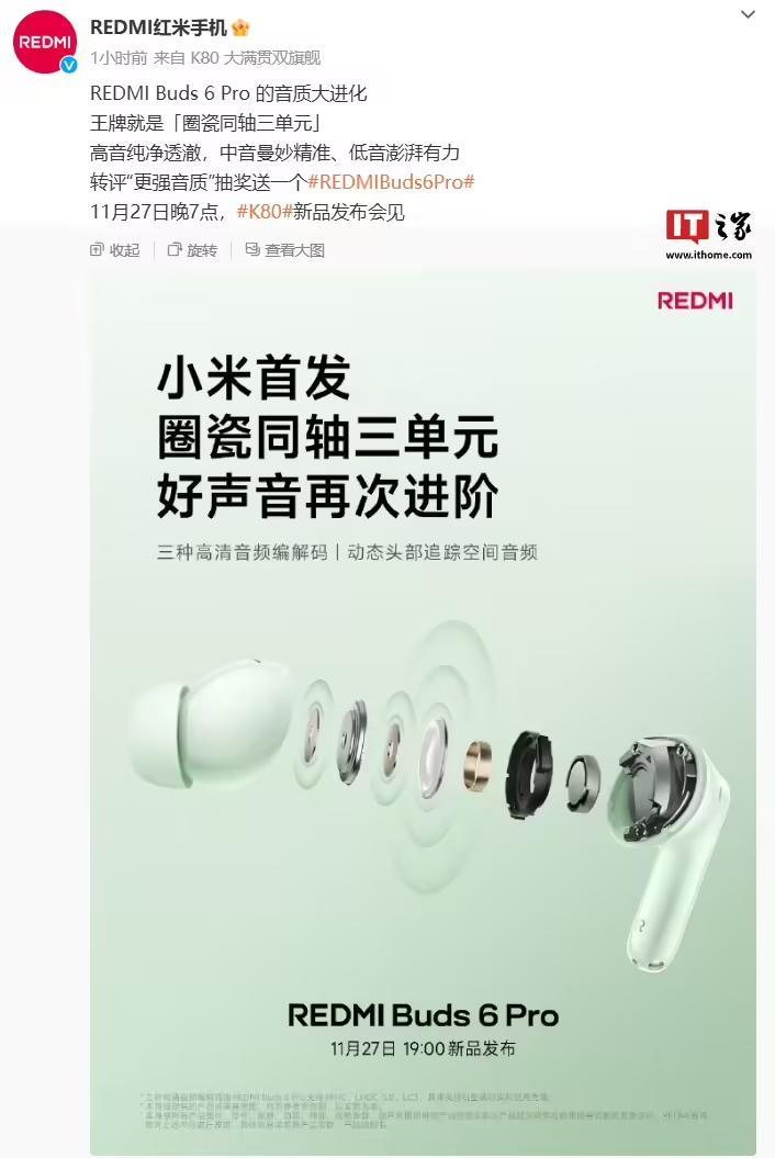 IT之家 11 月 24 日消息,小米在本月官宣将推 REDMI Buds 6 Pro 无线蓝牙耳机,该耳机将搭载“小米首款圈瓷同轴三单元”。
