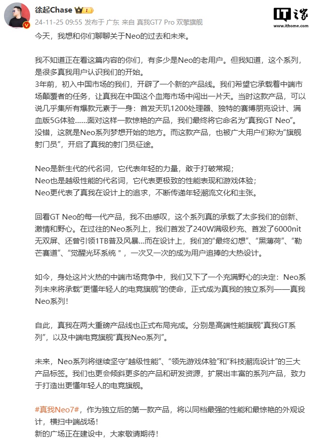 IT之家 11 月 25 日消息,realme 今日官宣,Neo 系列正式独立,真我 Neo7 手机下月见。“坚持越级性能、领先游戏体验、科技潮流设计,打造更懂年轻人的电竞旗舰”。