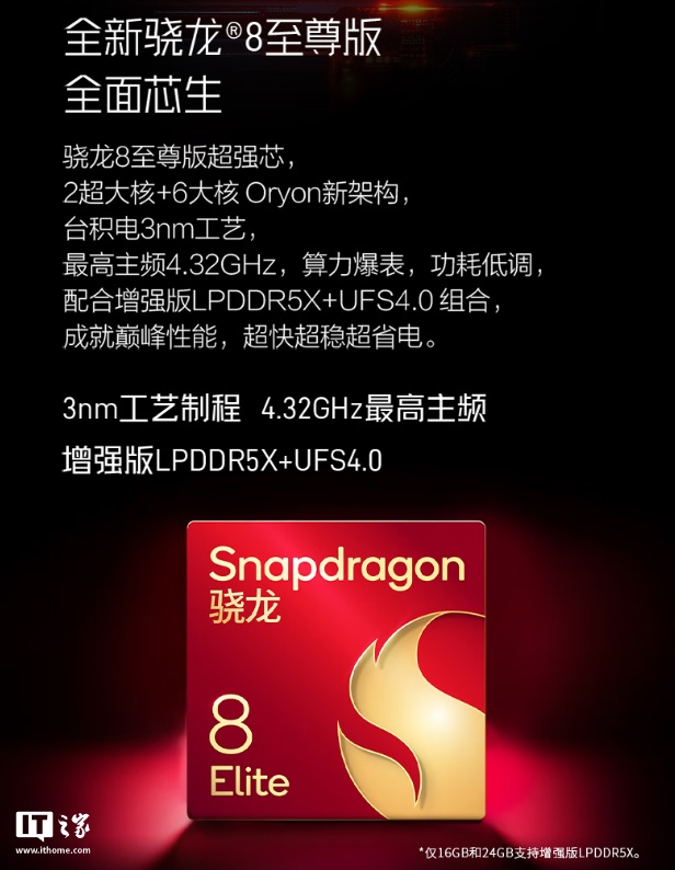 新机搭载最新骁龙 8 至尊版旗舰芯片,使用 LPDDR5X + UFS4.0(仅 16GB、24GB 版本支持增强版 LPDDR5X)组合;其内置 6150mAh 第二代南海高能电池(能量密度 823 Wh/L),支持 80W 快充。