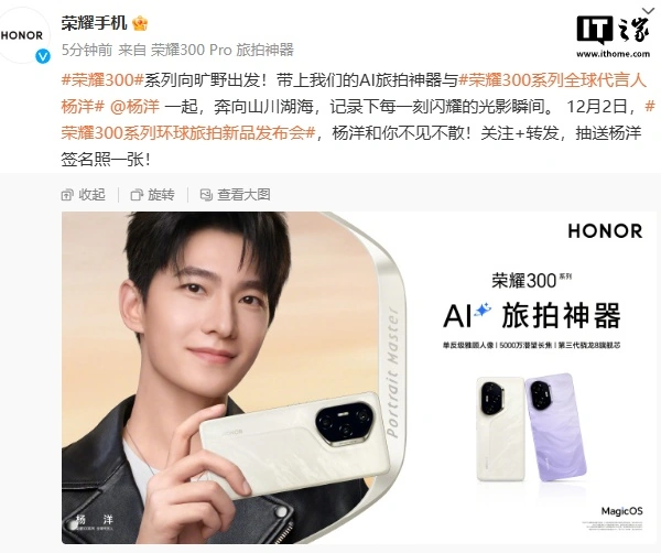 IT之家 11 月 25 日消息,荣耀今日宣布荣耀 300 系列环球旅拍新品发布会将于 12 月 2 日举行,官方海报显示该系列新机搭载单反级雅顾人像、5000 万潜望长焦、第三代骁龙 8 旗舰芯。