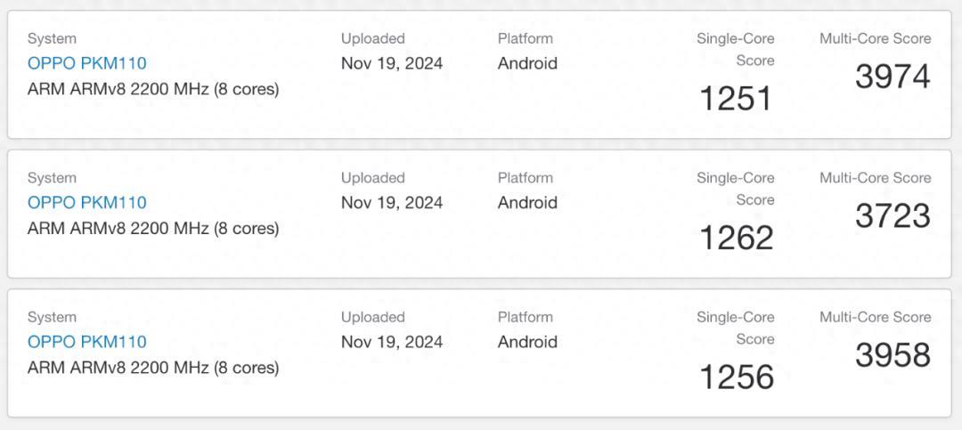 相关消息显示Reno13型号为PKM110,而Reno13 Pro型号为PKK110,Geekbench后台显示Reno13单核成绩在1250+,多核成绩3900±,12GB运存,搭载的处理器CPU频率为1*3.35GHz、3*3.2GHz、4*2.2GHz,消息称对应联发科天玑8350。