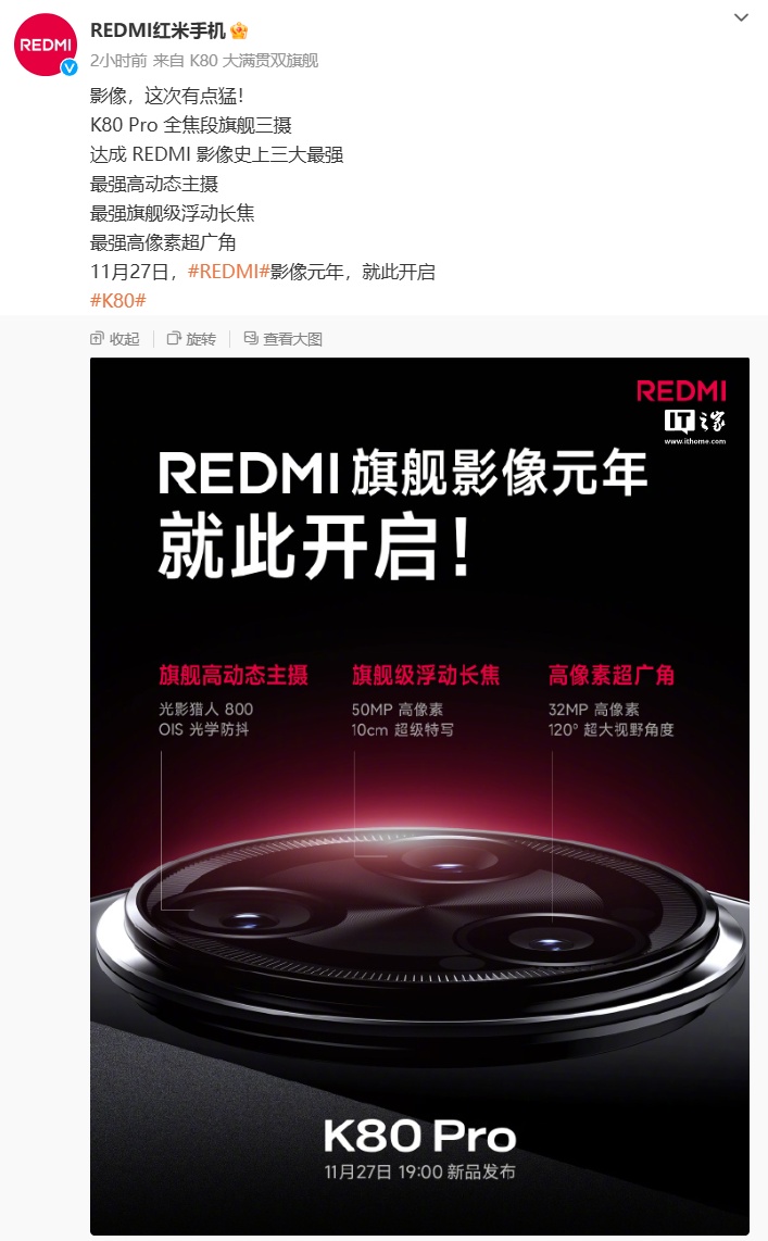 IT之家 11 月 25 日消息,小米今日官宣 REDMI K80 Pro 手机搭载全焦段旗舰三摄,达成 REDMI 影像史上“三大最强”,包括:旗舰高动态主摄 + 旗舰级浮动长焦 + 高像素超广角。