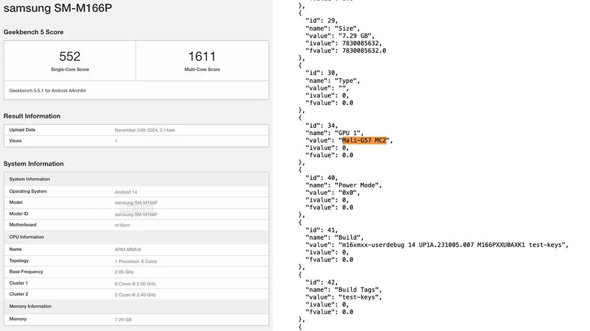 根据跑分库信息,Galaxy M16 5G 手机的型号为“SM-M166P”,采用八核处理器,包含两个 2.4GHz 核心和六个 2GHz 核心;GPU 为 Mali-G57 MC2,初步判断为联发科天玑 6300 芯片。