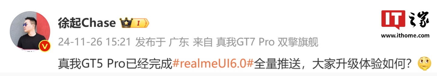 IT之家 11 月 26 日消息,真我 realme 副总裁、全球营销总裁、中国区总裁徐起今日宣布,真我 GT5 Pro 已经完成 realme UI 6.0 全量推送。