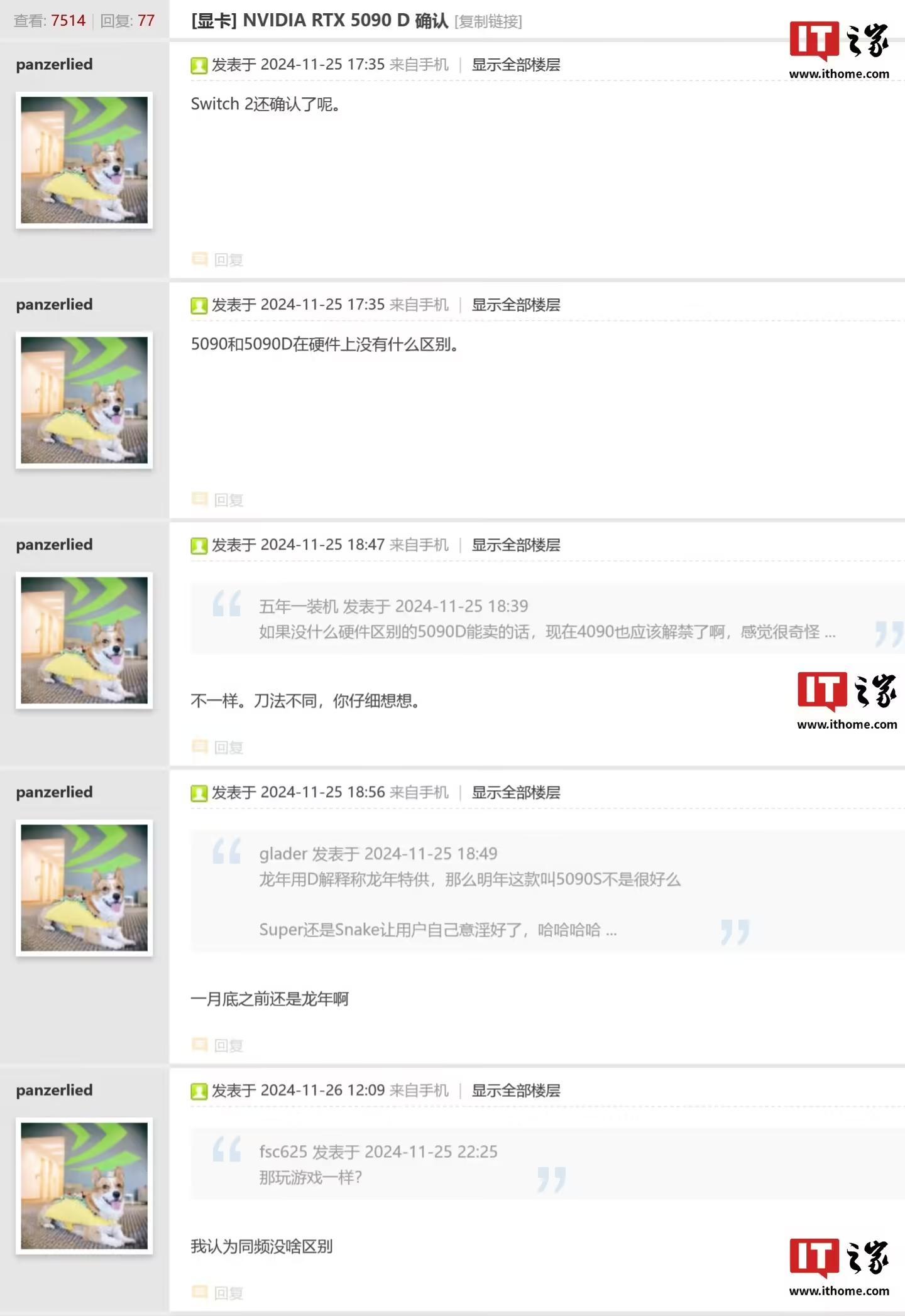 IT之家 11 月 26 日消息,Chiphell 论坛消息人士 panzerlied 昨今两日在回复有关英伟达 GeForce RTX 5090 D 显卡的帖子时表示“5090 和 5090D 在硬件上没有什么区别”,并认为两者在同频下游戏性能“没啥区别”。