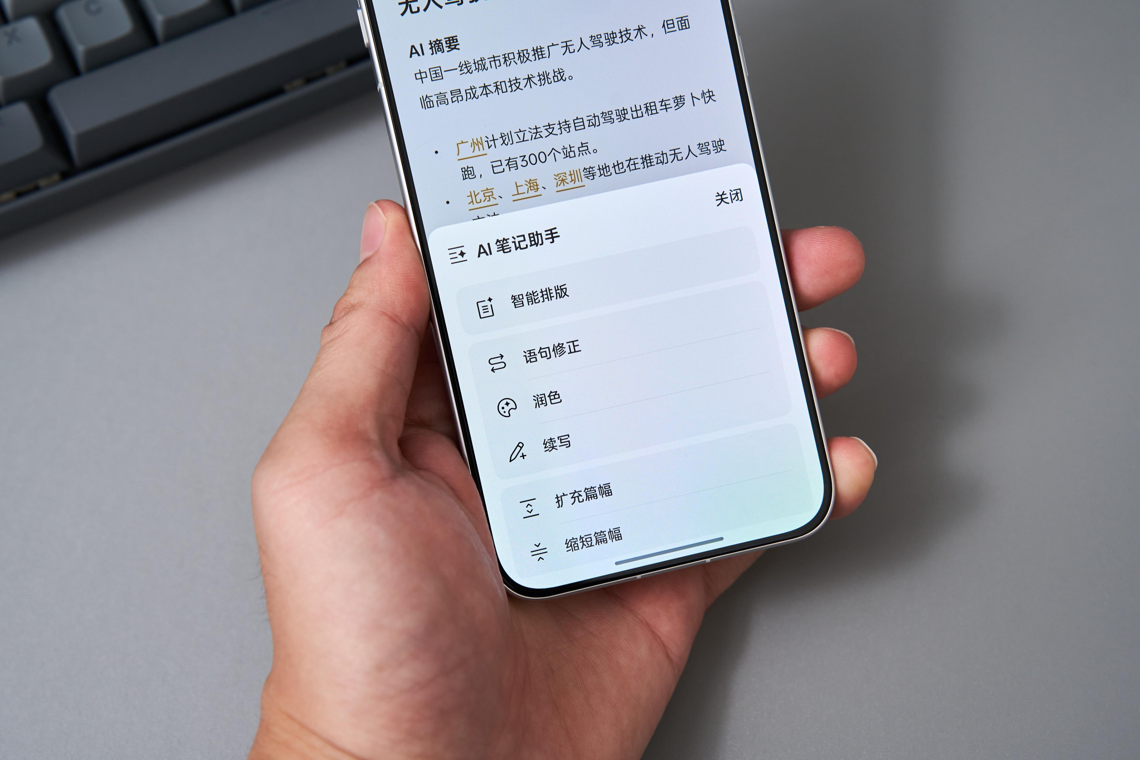 OPPO Reno13还给到了由AI赋能的“智慧便签”功能。在便签APP里,它可以帮助你智能排版、语句修正、润色、续写等。例如在你输入一大段话后帮你自动排版,自动调整字体、字号、行距等排版元素,让笔记信息更加整洁;又或者是帮你润色内容,根据你的指令输出特定文风,提升文本质量。