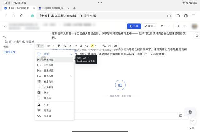 算了,又不是所有的人都用 WPS 、 Office 这类老旧软件去办公,就比方说我们编辑部就全员用上了飞书,主打一个协同高效,托尼心想:这要是再加上带键盘的小米平板 7 ,这办公效率不得起飞喽哇?