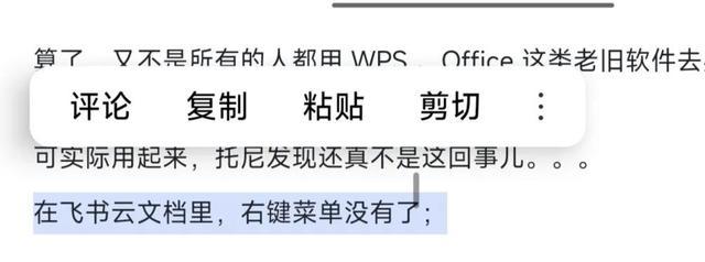 在飞书云文档里,选定文段后出现的只有评论、粘贴、复制这几个功能,而原本在电脑端方便的功能栏却不见了,想要设置个标题、字体颜色啥的还得去底栏找。