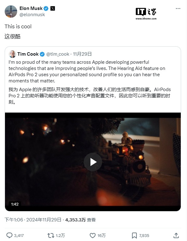 苹果 CEO 蒂姆・库克周四分享了一则助听功能的广告,视频中一位听力受损的父亲使用 AirPods Pro 2 助听功能来聆听女儿拆开圣诞礼物的声音。对此,马斯克回应道:“这很酷。”