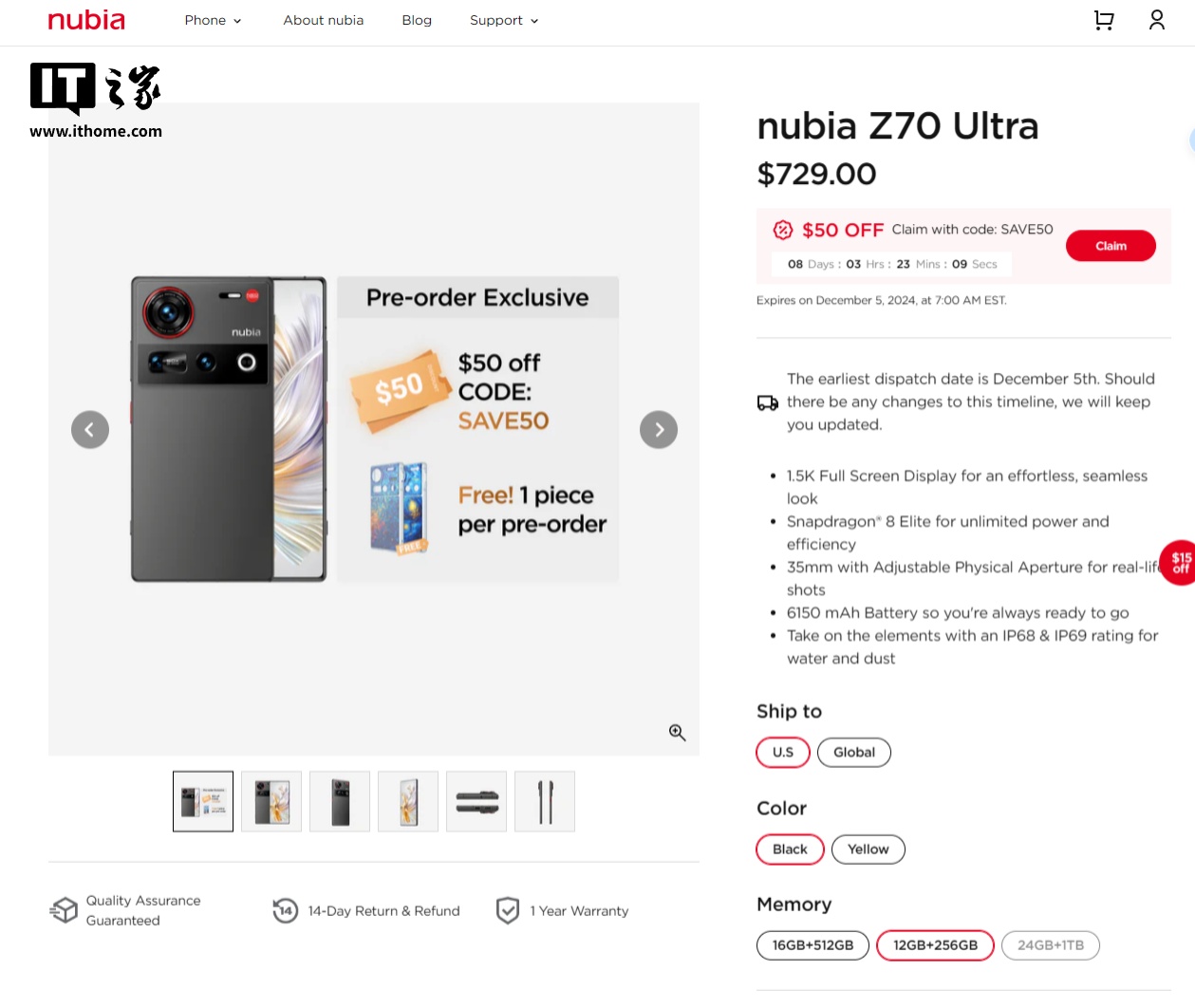 IT之家 11 月 27 日消息,努比亚 Z70 Ultra 今日在海外市场上市,包括美国市场,这也是该国首款搭载骁龙 8 Elite 处理器的手机,该机在美国的售价为 729 美元(IT之家备注:当前约 5289 元人民币)起,目前官网正在进行促销活动,新用户可享受 65 美元的优惠。