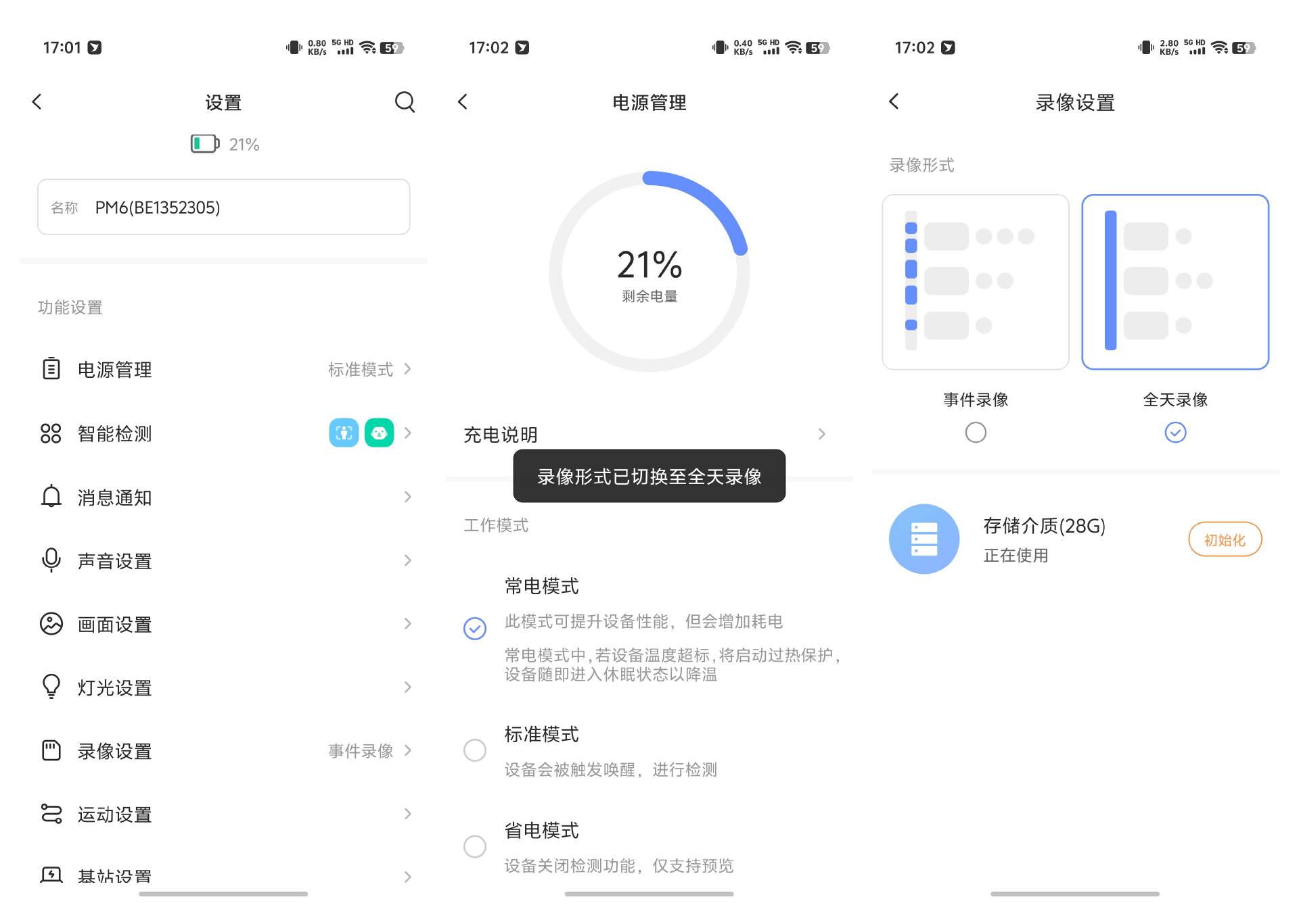 由于萤石 TAMO 本质也是一个摄像头,所以提供了萤石摄像头所具备的实时视频、录像等一系列基础功能,以及选择常电模式、自定义模式、省电模式等。