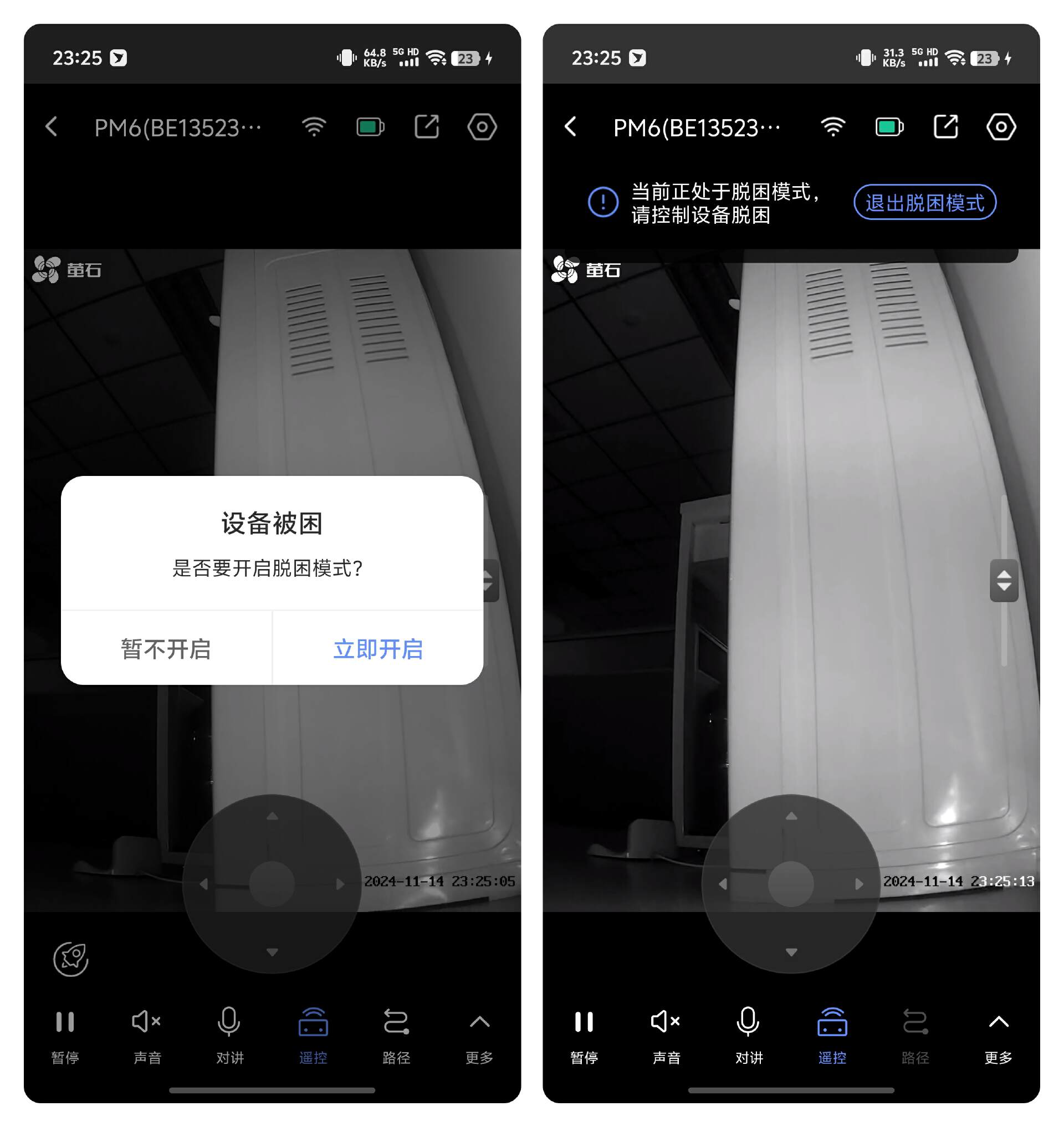 在遥控操作过程中,如果萤石 TAMO 被卡住,又或者遇到较高的地毯等场景,这时候遥控界面会弹出脱困模式,右下角也会有小火箭标识,这是冲刺模式按钮,开启后,TAMO 会调用最大扭矩输出,以更强的机动性摆脱困境。