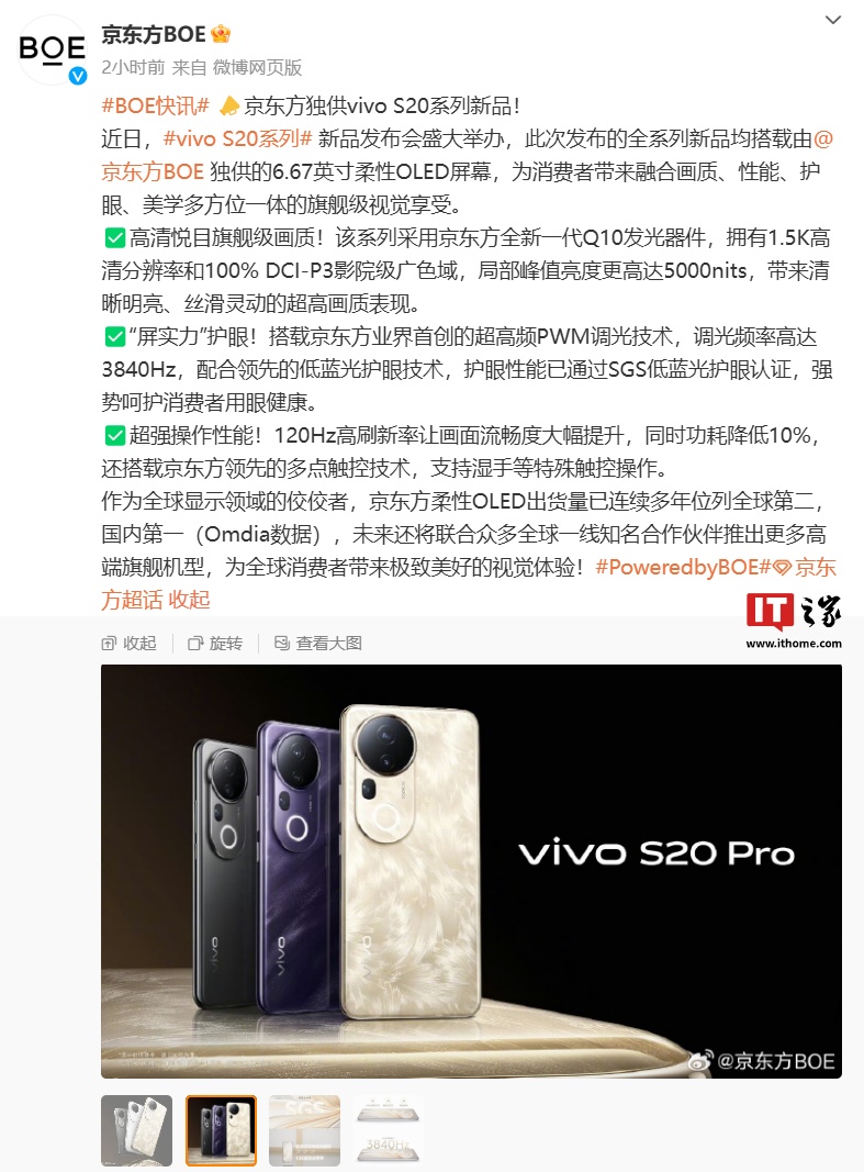 文章来源于互联网:IT之家-京东方独供 vivo S20 系列手机屏幕:Q10 发光器件、局部峰值亮度 5000nits