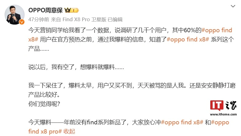 IT之家注意到,OPPO Find 系列产品负责人周意保今日发文称“调研了几千个用户,其中 60% 的 OPPO Find X8 用户在官方预热之前,通过我爆料的信息,知道了 OPPO Find X8 系列这个产品。”另外,他还透露“年前没有 Find 系列新品”。