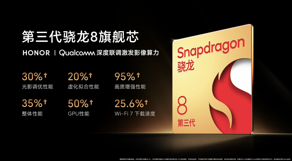 而在规格方面,荣耀 300 搭载骁龙 7 Gen 3,荣耀 300 Pro 搭载高通骁龙 8 Gen 3,Pro 机型支持 Wi-Fi 7 技术。