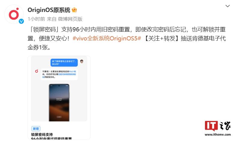 IT之家 12 月 2 日消息,vivo 手机操作系统官方今日发文宣布,OriginOS 5 系统新增“锁屏密码”96 小时内用旧密码重置功能,该功能适配 X200、S20 、iQOO 13 系列等手机。