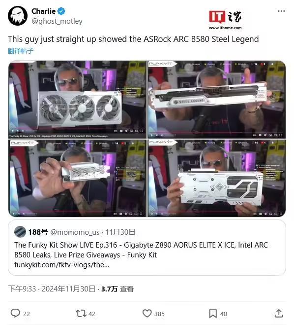 IT之家 12 月 3 日消息,消息源 FunkyIT 于 11 月 30 日发布视频,分享了华擎(ASRock)锐炫(Arc)B580 Steel Legend 12 GB “Battlemage”显卡,揭示了其外观设计、散热方案和主要功能。