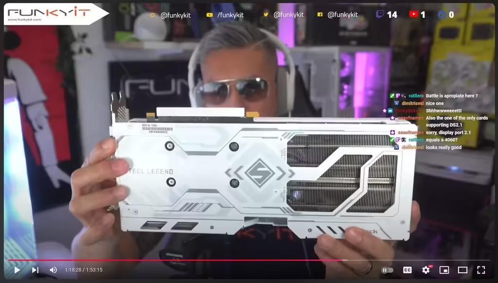 根据消息源分享的视频(截至IT之家发文前,已被删除),该显卡配备了大型铝制双鳍片堆叠散热器和三个风扇,金属双色调的散热器护罩,PCB 长度约为显卡总长度的一半,近一半的散热器气流会穿过显卡并从背板的大型切口排出。