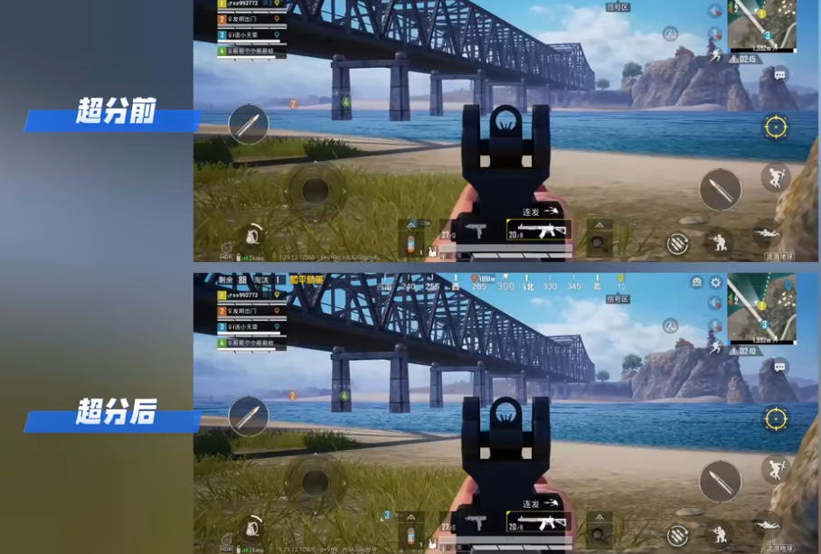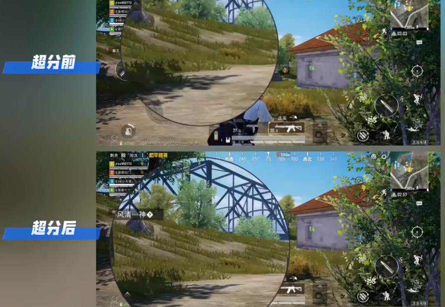 比如在《和平精英》中,iQOO Neo10 Pro 支持 1.5K+144fps 超分超帧并发,大家可以对比一下超分前后的画面对比,草地和武器的细节明显提升。