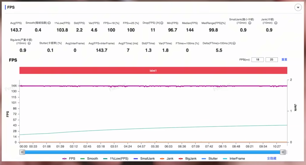同时,在联发科、iQOO 与 Arm 的三方联调之下,iQOO Neo10 Pro 通过全新一代帧率感知引擎,对游戏场景逐帧识别和负载计算,轻松实现了主流游戏无限稳帧。在IT之家的测试中,30℃暖气房里使用 5G 网络,插官方充电器边充电边玩的场景下,连续进行两局 144 fps 极致画质《王者荣耀》排位赛,共约 30 分钟。即使是在这种条件下,帧率依然非常稳定,平均帧率达到 143.8fps,非常丝滑平稳。