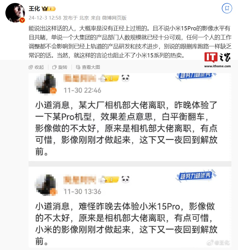 IT之家 12 月 3 日消息,有网友在 11 月 30 日发布“某厂相机部门大佬离职”的消息,小米公关部总经理王化今日发文称,单说一个大集团的产品部门人数规模就已经十分可观,任何一个人的工作调整都不会影响到已经上轨道的产品研发和技术进步。