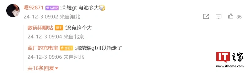 评论区中有网友询问荣耀 GT 手机的电池容量,博主回复称“没有这个大”,此处预计指荣耀 GT 手机的电池容量<6500mAh。