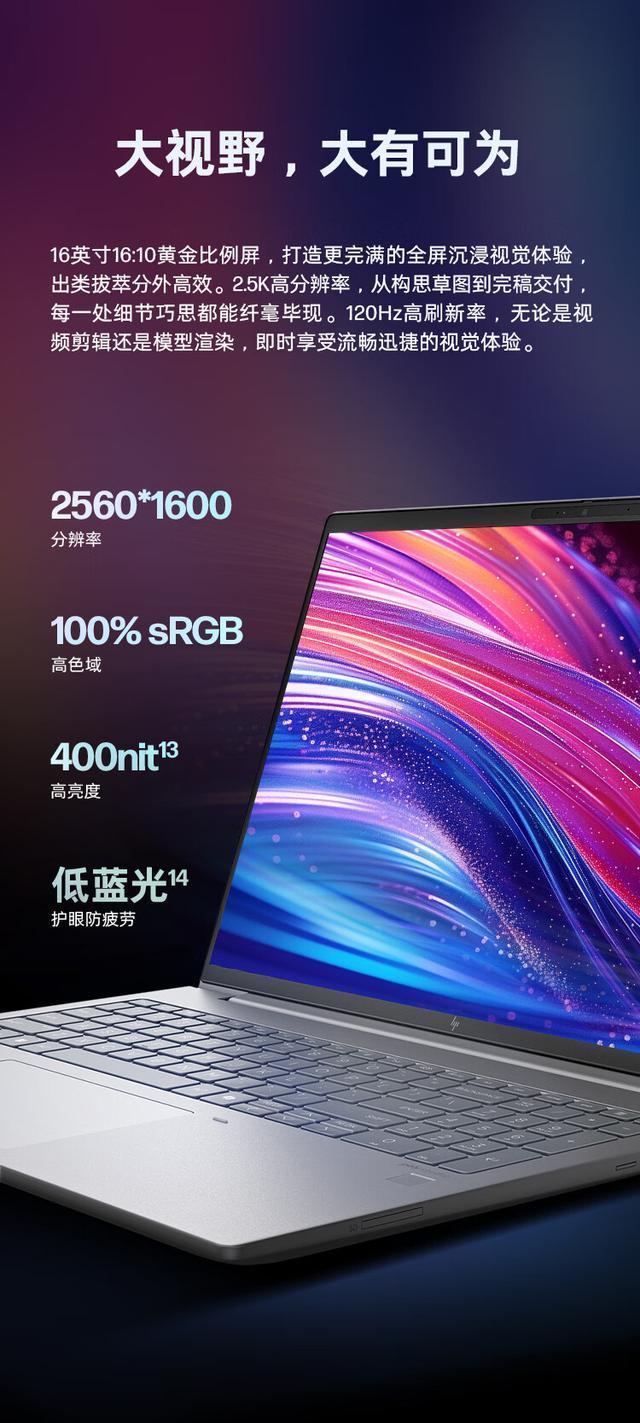 惠普 2024 款战 99 商务本搭载一块 16 英寸 2560×1600 分辨率(16:10 长宽比)的 120Hz 高刷显示屏,拥有 100% sRGB 色域和 400nit 亮度,支持低蓝光特性。