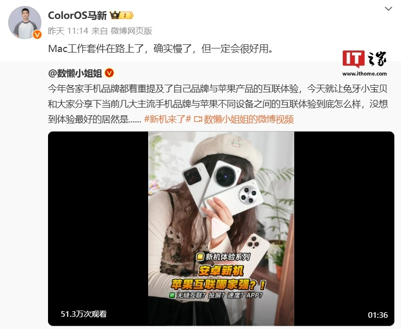 IT之家 12 月 5 日消息,OPPO ColorOS 用户体验与解决方案总监马新昨日发文称“Mac 工作套件在路上了,确实慢了,但一定会很好用。”