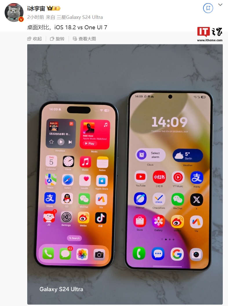 IT之家 12 月 5 日消息,博主 @i冰宇宙 今日(12 月 5 日)发布微博,分享了三星 One UI 7.0 系统动画效果,并与 iPhone 的桌面进行对比。