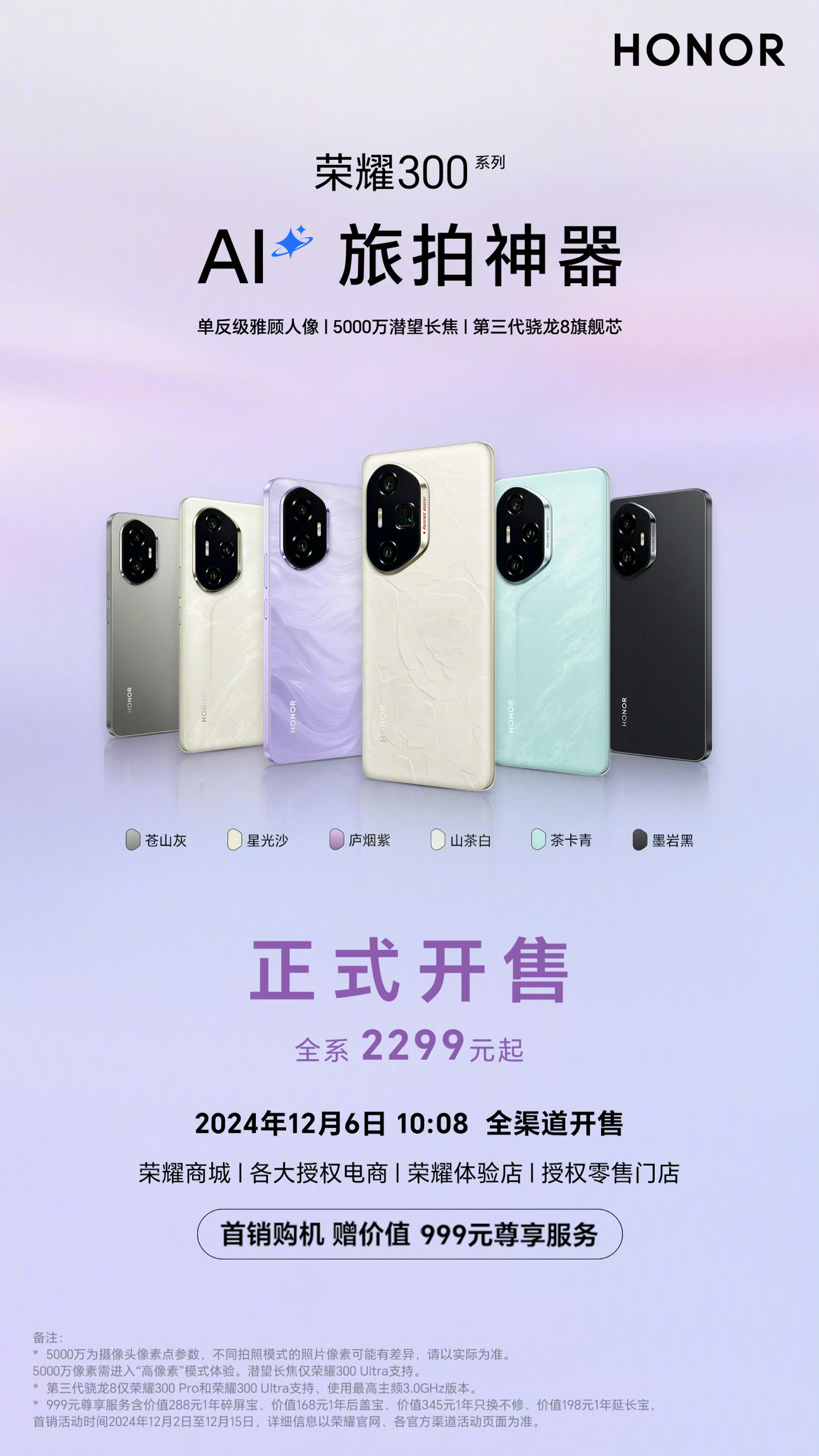 IT之家 12 月 6 日消息,荣耀 300 系列手机将于今日 10 时 08 分正式开售,该机推出荣耀 300、荣耀 300 Pro、荣耀 300 Ultra 三种配置。