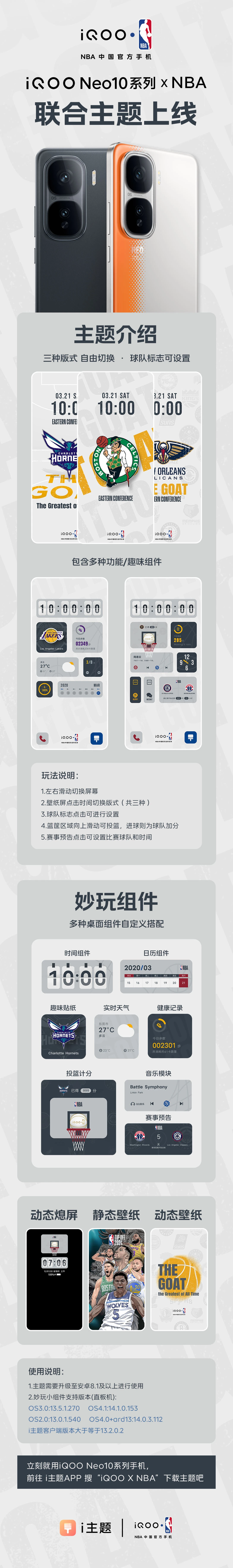 文章来源于互联网:IT之家-iQOO Neo10 系列手机 NBA 联合主题上线:含球队锁屏壁纸、投篮组件、联名特效等
