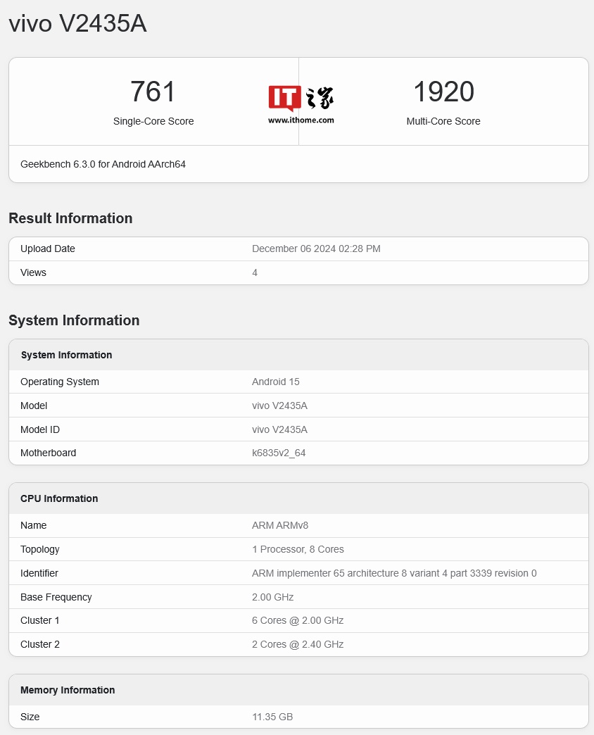IT之家 12 月 7 日消息,型号为“V2435A”的 vivo 手机昨日(12 月 6 日)现身 GeekBench 跑分库,6.3.0 版本单核成绩为 761 分,多核成绩为 1910 分。