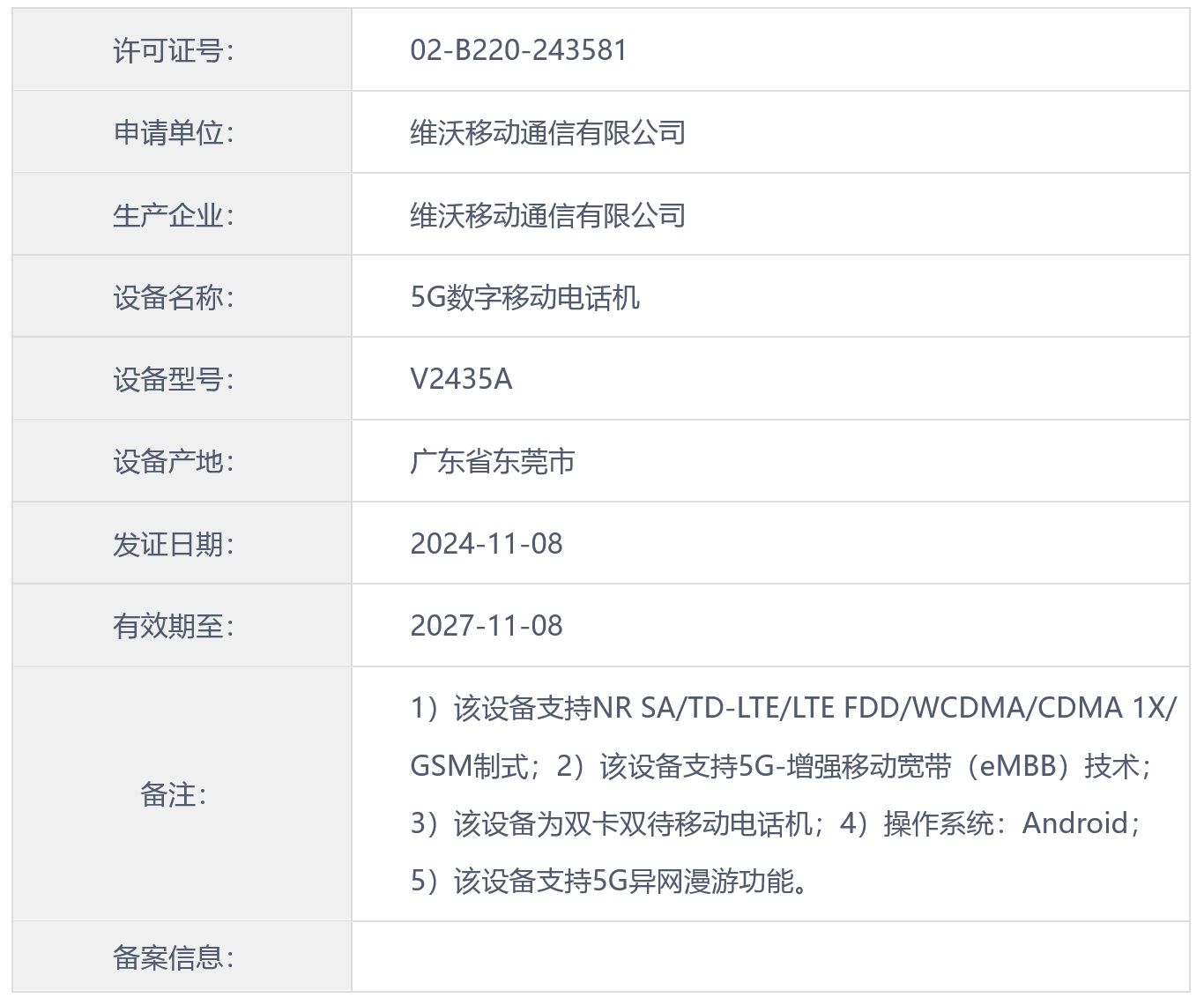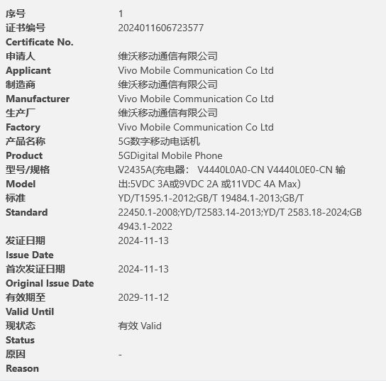 型号为“V2435A”此前已通过国内 3C 认证,显示支持 44W 有线充电,目前尚不清楚该手机上市后对应产品名称。